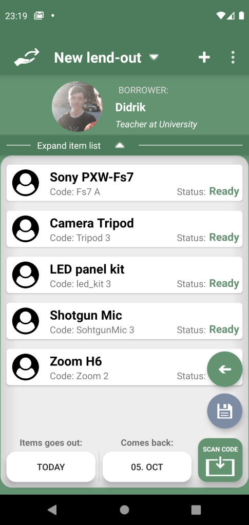 For efficiency, you can use QR codes and barcodes (and even nfc) to find the item or borrower in the system easier, both when just looking in the systems page, or during lend-out.The icon is bottom right, and says “Scan code”. When you initialize the app and have populated it with items and borrowers, you need to dedicate some hours to plan, print and place the codes on the items. Things you need to think about is: